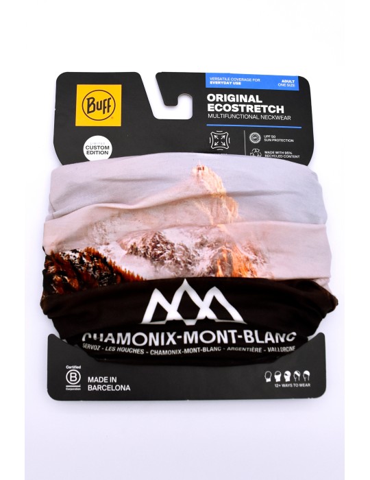 Keep your head warm with this Chamonix Mont blanc buff. Adult one size. Seamless 4-way stretch construction. Made with 95% recycled content. Made in Europe.