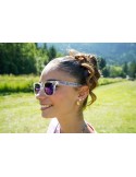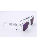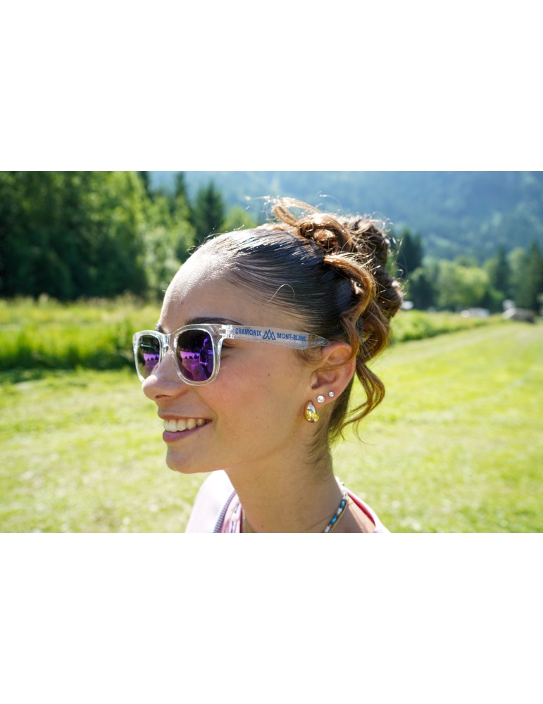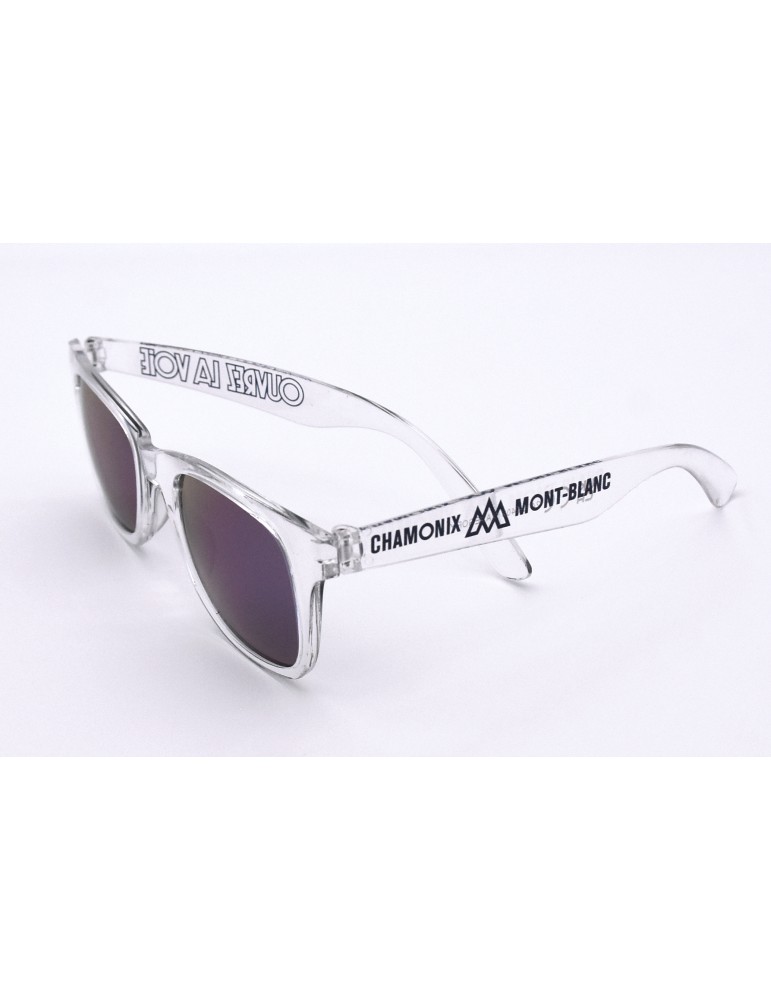 Transparent sunglasses sold with a soft case in Chamonix colours. UV400 protection. Made in China. Branded in Annecy.